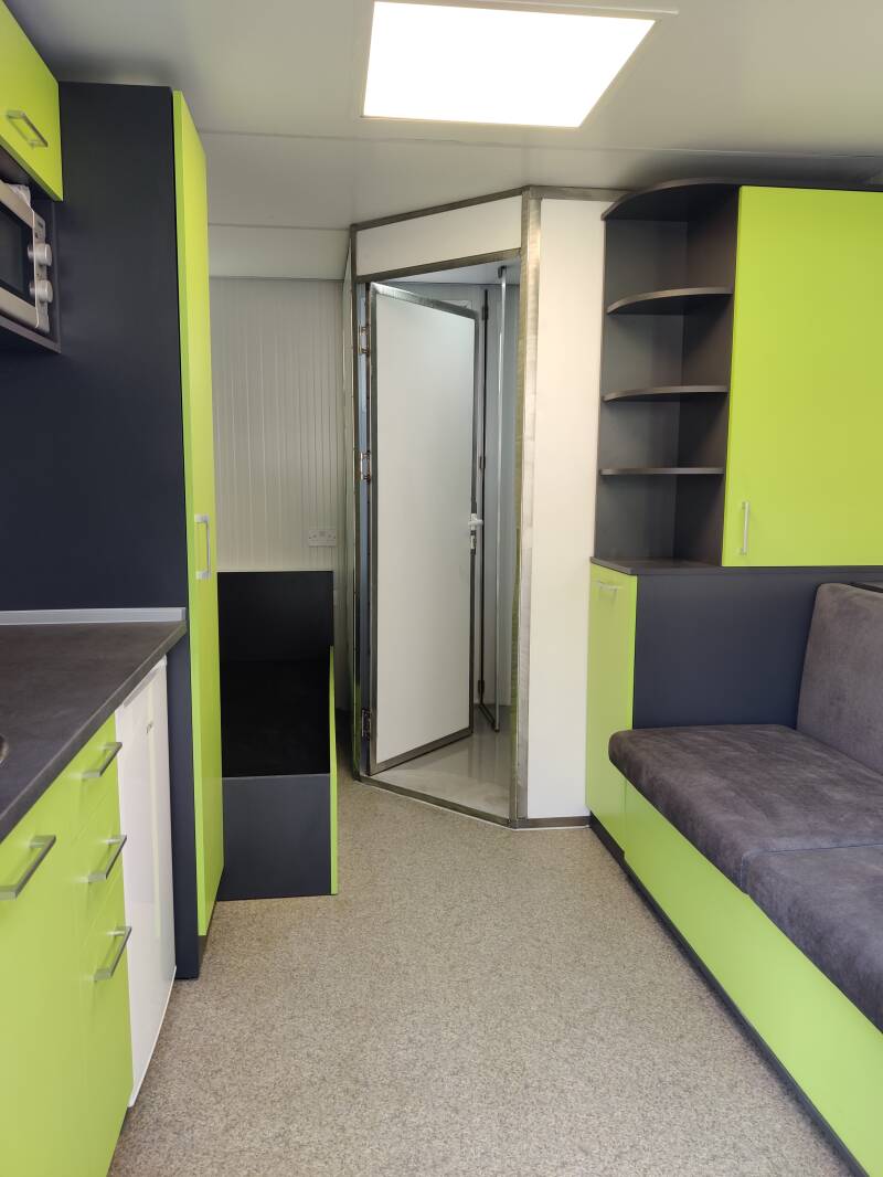 Designed and built for warmth and comfort, the Augusta Sleeper is a modular site sleeping accommodation unit that offers clean, functional temporary living space. The modern living area comprises of either a single bed with sofa or 2 singles with reading lights, cupboards and a wardrobe.